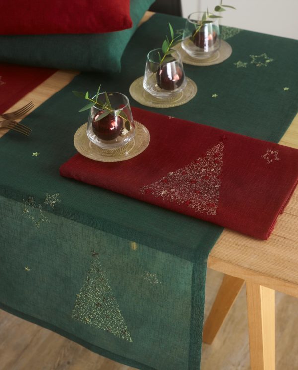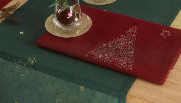 Tradycyjne świąteczne odcienie, takie jak czerwień i zieleń, w połączeniu z charakterystycznym haftem w harmonijnie dobranych kolorach sprawiają, że ta dekoracja stołu od razu przyciąga wzrok.