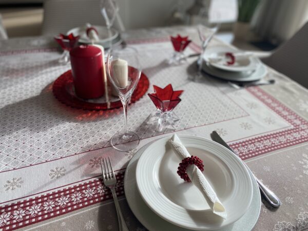 Obrus w stylu skandynawskim w kolorze czerwonym i beżowym – NOWOŚĆ!