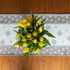 Obrus zachwyca harmonijnym wzorem szarotek, który subtelnie zdobi tkaninę o wysokiej gramaturze. Dzięki starannemu tkaniu z wysokogatunkowych przędz jest nie tylko elegancki, ale także trwały i łatwy w pielęgnacji. Naturalne kolory zachowują świeżość przez lata, a materiał doskonale się prasuje.