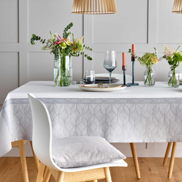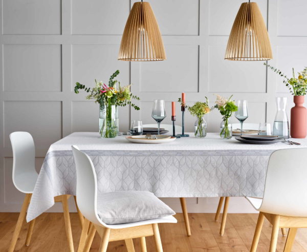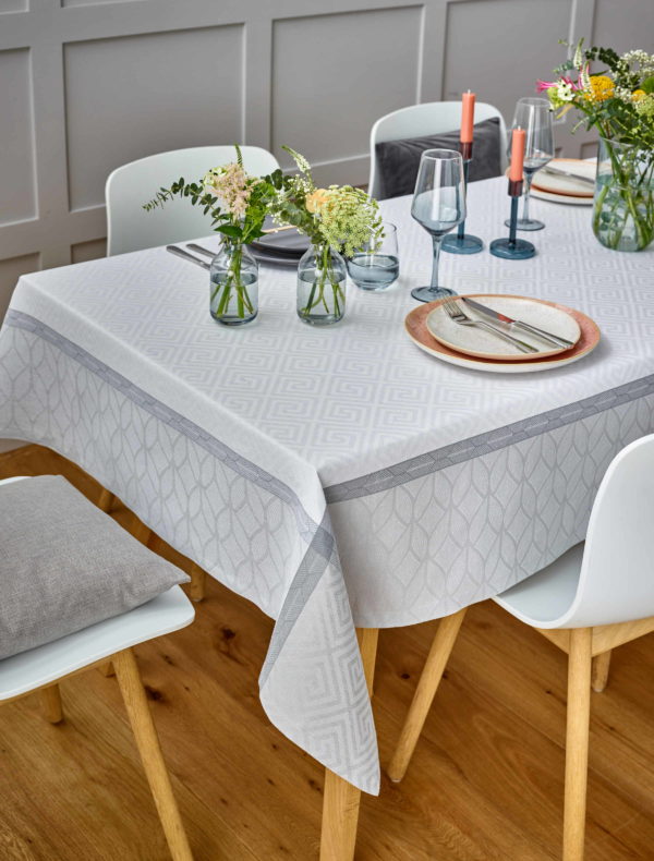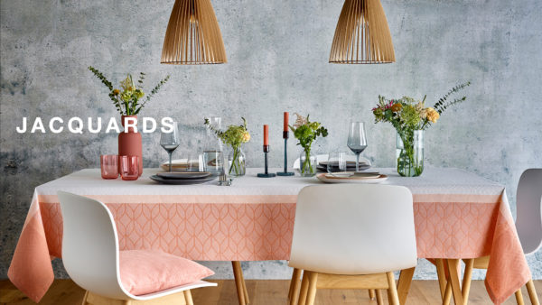 Obrus z tkaniny żakardowej wykonany w połowie z lnu i bawełny w dwóch aktualnie modnych kolorach: srebrnoszarym i białym oraz łososiowo-białym.