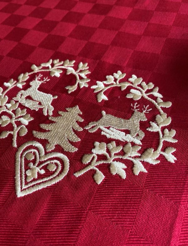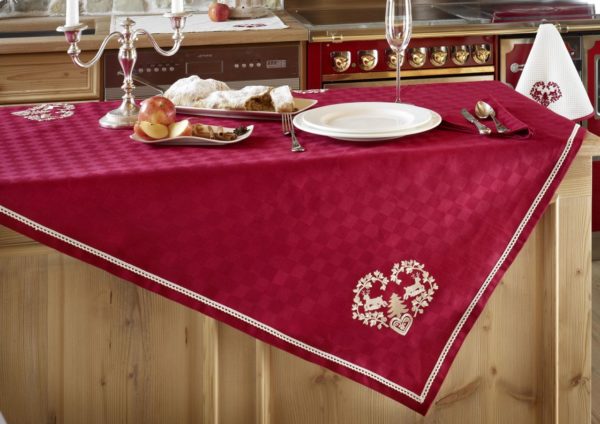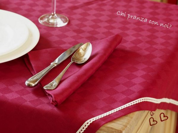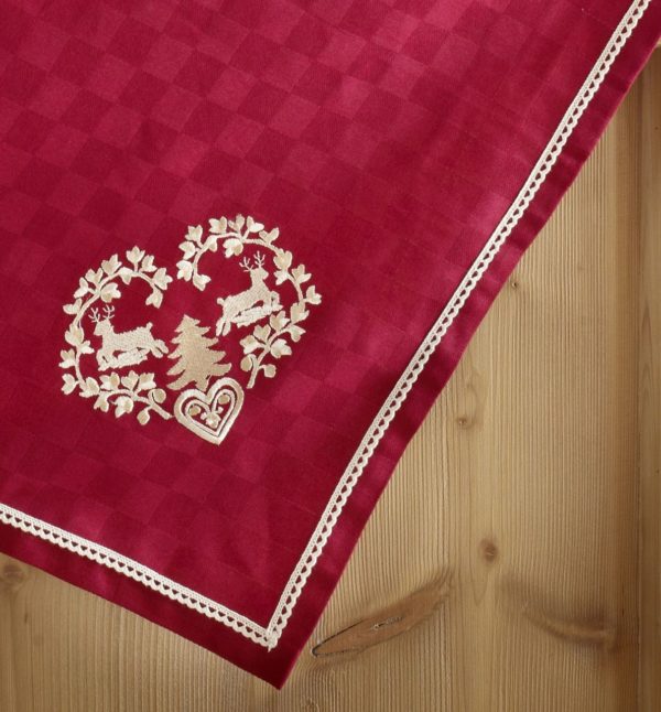 Subtelna krata, efektownie haftowana aplikacja z motywem serca w kolorze złotym lub czerwonym oraz koronkowa lamówka dodają elegancji i stylu. Dzięki nim obrus Gran Paradiso idealnie komponuje się we wnętrzach urządzonych zgodnie ze współczesnymi trendami, wprowadzając do nich szczyptę włoskiej oryginalności. Produkt charakteryzuje się wyjątkową trwałością, a dzięki bawełnie z farbowanej przędzy, kolory na tym obrusie pozostają żywe nawet po wielu praniach.