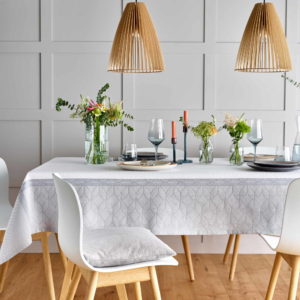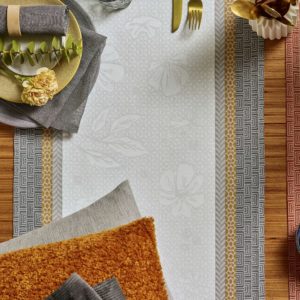 Obrus żakardowy POMPEJI Obrus z tkaniny żakardowej wykonany w połowie z lnu i bawełny w dwóch aktualnie modnych kolorach: srebrnoszarym i białym oraz łososiowo-białym. Ta ponadczasowa elegancja ma nazwę – POMPEJI. Klasyczne ozdoby i harmonijne kolory idealnie połączono...